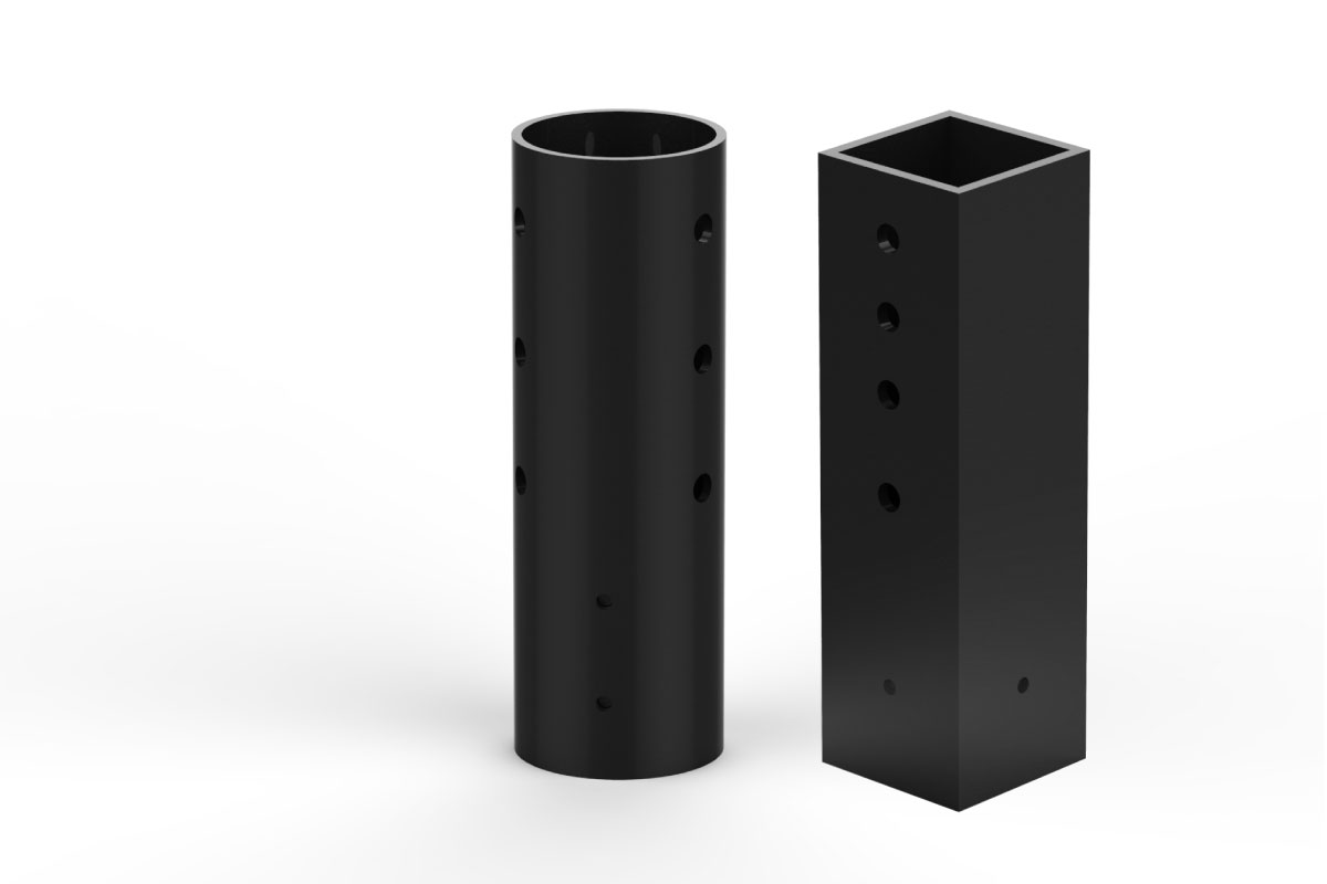 • Our Adaptors are constructed of square or round steel tubing (11G) with a 2-3/8″ OD tenon. Each adaptor is secured with 3/8″ stainless steel Allen Set Screws and use black plastic snap-in end caps. Consult factory for a custom configuration or other mounting options.